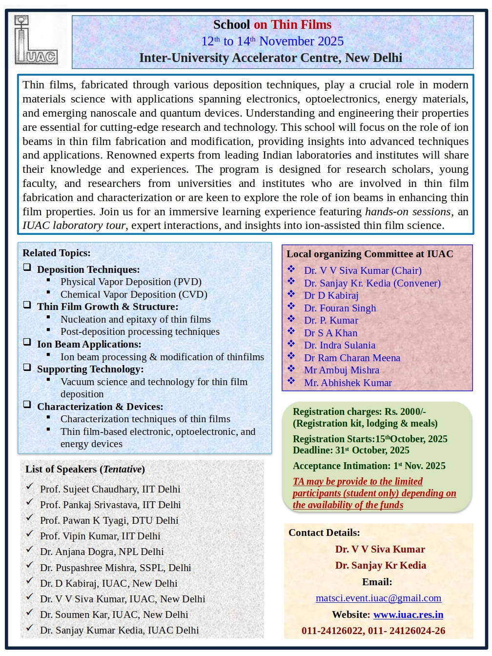 Thin films, fabricated through various deposition techniques, play a crucial role in modern materials science with applications spanning electronics, optoelectronics, energy materials, and emerging nanoscale and quantum devices. Understanding and engineering their properties are essential for cutting-edge research and technology. This school will focus on the role of ion beams in thin film fabrication and modification, providing insights into advanced techniques and applications. Renowned experts from leading Indian laboratories and institutes will share their knowledge and experiences. The program is designed for research scholars, young faculty, and researchers from universities and institutes who are involved in thin film fabrication and characterization or are keen to explore the role of ion beams in enhancing thin film properties. Join us for an immersive learning experience featuring hands-on sessions, an IUAC laboratory tour, expert interactions, and insights into ion-assisted thin film science.