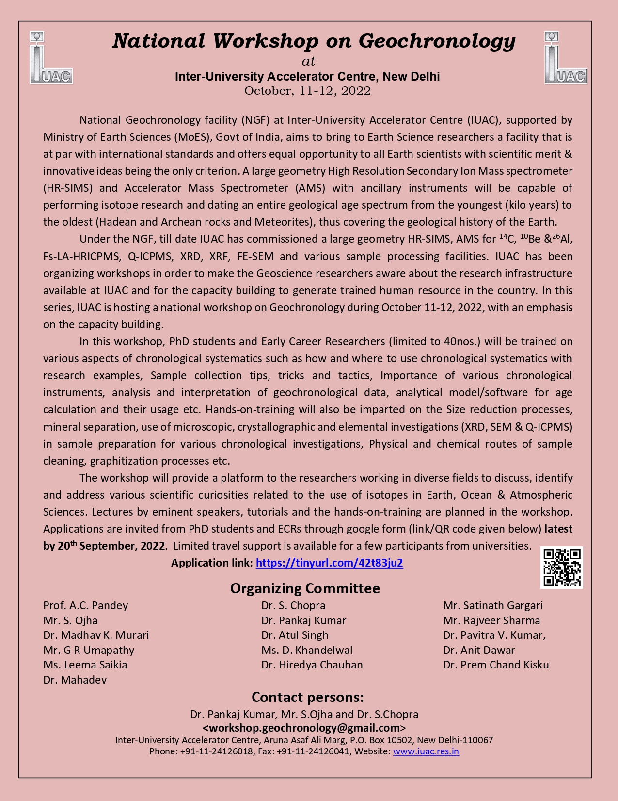National Geochronology facility (NGF) at Inter-University Accelerator Centre (IUAC), supported by Ministry of Earth Sciences (MoES), Govt of India, aims to bring to Earth Science researchers a facility that is at par with international standards and offers equal opportunity to all Earth scientists with scientific merit & innovative ideas being the only criterion.